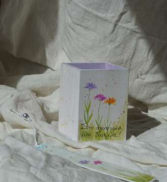 Τα αντικείμενα που κατασκευάζουμε και θα φτάνουν σ’εσάς σιγά-σιγά, είναι όλα φτιαγμένα από τα χέρια μας, με παραδοσιακές τεχνικές. Ελπίζουμε να σας ταξιδέψουμε σε έναν κόσμο γεμάτο χρώματα και ιστορίες.