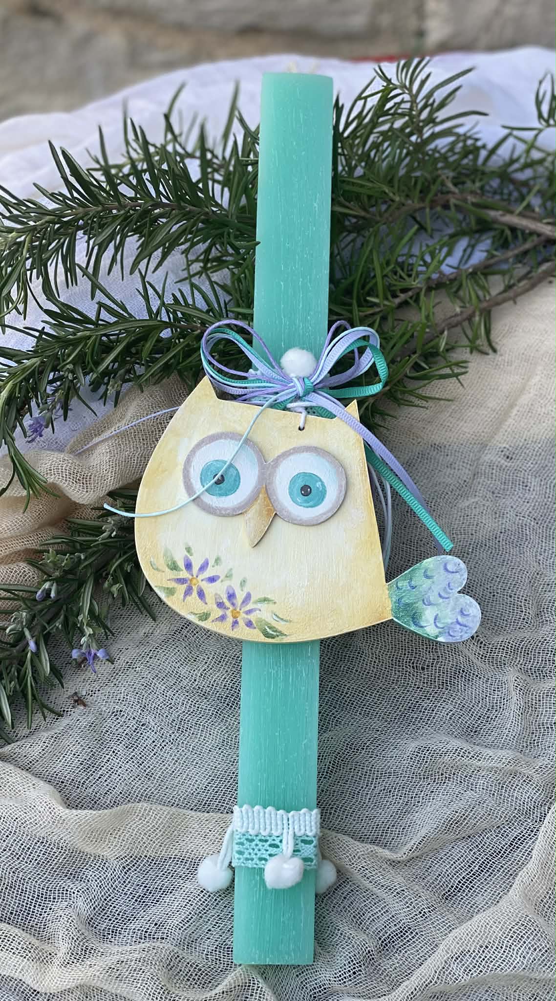 λαμπάδα από αρωματικό ξυστό κερί 31cm με ξύλινο στοιχείο κουκουβάγια